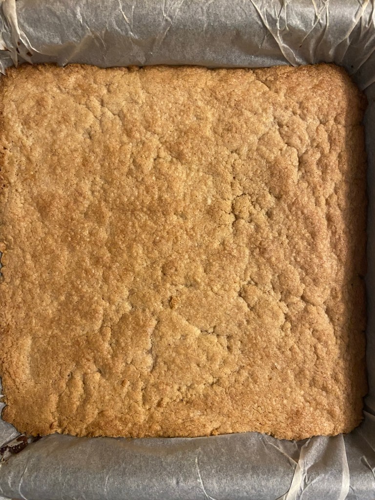 - Press the biscuit base into the prepared tin and bake in the oven for 15-18 minutes until lightly golden. Leave to cool in the tin on the side for later.